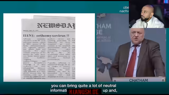 01:42:46Marc van Ranst, belgischer Top-Virologe, gab in einem Chatham House-Vortrag 2019 zu, wie er während der Schweinegrippe durch gezielte Angstkampagnen und Medienkontrolle Impfstoffe durchsetzte. Er beschrieb Strategien wie das Besetzen der Nachrichtenagenda in den ersten Krisentagen, das Erzeugen künstlicher Impfstoff-Nachfrage und die Ausnutzung von Todesfallmeldungen. Chatham House wurde als von Gates und anderen Elitenorganisationen finanziert dargestellt.