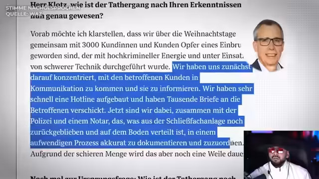 00:33:20Es werden die Konsequenzen des Raubes beleuchtet. 3000 Kunden waren betroffen, und die Versicherungssumme für Schließfachinhalte beträgt maximal 10.300 Euro, was vielfach als unzureichend angesehen wird. Der Streamer kritisiert, dass bei dem Raub keine Alarmsysteme ausgelöst wurden, obwohl diese als 'Stand der Technik' gelten. Dies wirft Fragen auf, ob die Systeme manipuliert waren oder versagt haben, und ob die Sparkasse möglicherweise nicht ausreichend kooperierte.