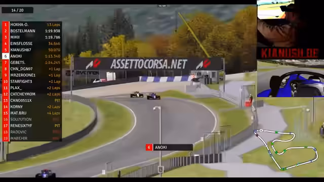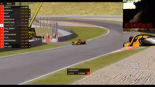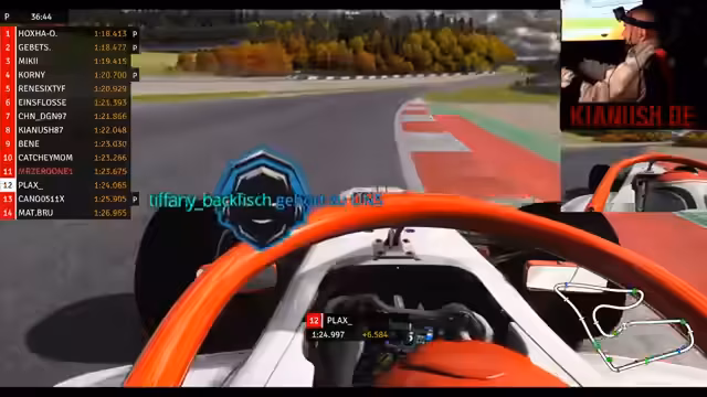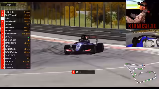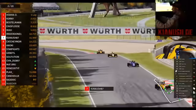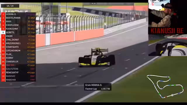02:22:18Im Rennen um die vorderen Plätze wird es immer spannender. Während Kianus den Ching Chingi überholen kann, holt sich Gibitz im_background immer weiter auf. Mit dem DRS-System auf der Geraden besteht die Möglichkeit, weitere Positionen gutzumachen. Kianus bleibt stabil auf dem fünften Platz, während Miki ebenfalls einen Überholversuch startet. Die Konkurrenz ist dicht, und jede Runde ist wichtig, um die Position zu sichern oder auszubauen.