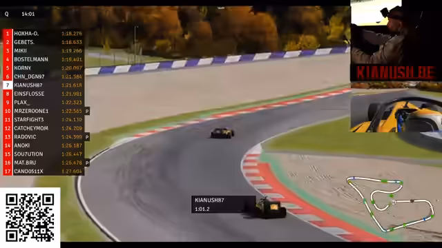 00:39:08Das Event beginnt mit dem Training, in dem die 18 angemeldeten Fahrer die Zeit nutzen, um sich einzufahren und die Strecke zu lernen. Die Kommentatoren analysieren die aktuellen Rundenzeiten und heben besonders die starken Leistungen der Top-Fahrer wie Gebetz und Erwin hervor, die bereits Zeiten im Bereich von 1:18 erzielen. Gleichzeitig wird der Fahrer Kianus erwähnt, der sich nach und nach nach vorne arbeitet und sein Ziel, in die Top 5 zu kommen, klar kommuniziert. Das Training dient als Vorbereitung für das anstehende Qualifying und zeigt, wie eng das Fahrerfeld beieinanderliegt und wie entscheidend jede hundertstel Sekunde sein wird.