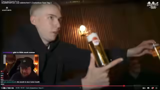 04:00:33Der Streamer berichtet von einer Kneipentour in Köln, die er mit einer Gruppe absolviert hat. Er schlägt ein Bewertungssystem für Kneipen vor, das auf Faktoren wie Ambiente, Service und Trinkfaulbarkeit basiert. Die Gruppe besucht mehrere Etablissements und bewertet diese. Ein Fokus liegt auf der speziellen Kölner Trinkkultur, wie dem Kölsch und dem System der Bierdeckel, das eine schnelle Nachfüllung ermöglicht.