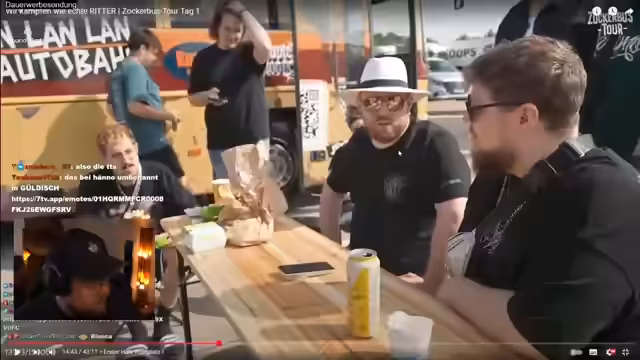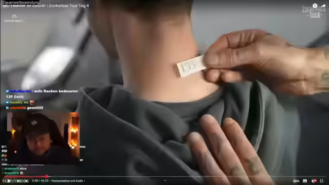 07:10:39Auf dem Festivalgelände angekommen, bewegt sich die Gruppe durch die Menschenmassen. Die Diskussion über den Verbleib des Busses und die Möglichkeit, spontan im Bus zu zocken, zeigt die flexible und unkonventionelle Herangehensweise. Es wird die gewaltige Anzahl an Besuchern und die Shuttle-Optionen mit dem Bus thematisiert. Die logistischen Herausforderungen wie die 300 Meter Höhenunterschied auf der gesamten Strecke und die unmittelbare Nähe zur Bühne werden angesprochen. Ein spontaner Besuch bei einem Tattoo-Studio wird inszeniert, wobei sich ein Abonnent und sein Sohn eine Tätowierung stechen lassen. Die witzige Aktion, bei der die Streamer nach einer Zahlenfolge tätowiert werden, die für die Szene von Bedeutung ist, zeigt die besondere Dynamik und den Humor der Gruppe.