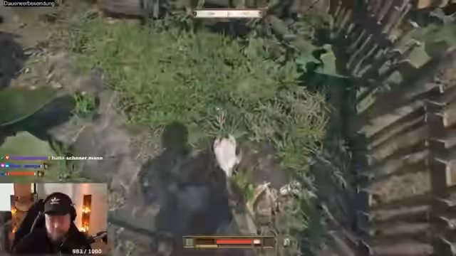 01:44:19Der Streamer und sein Begleiter beschließen, sich im Fluss zu waschen, treffen dort auf badende Frauen und werden anschließend von Banditen überfallen. Sie fliehen nackt vor den Angreifern und versuchen, sich in Sicherheit zu bringen. Der Streamer kommentiert die dämliche Situation und die Notwendigkeit, die Kleidung der Banditen zu stehlen. Er versucht, unbemerkt an den Banditen vorbeizukommen, wird aber entdeckt und muss fliehen. Es kommt zu einer Verfolgungsjagd durch den Wald, bei der der Streamer versucht, seinen Begleiter zu beschützen. Er findet einen Weg aus dem Felsengewirr und trifft wieder auf seinen Begleiter. Gemeinsam besiegen sie einen Banditen und befreien sich von ihrer misslichen Lage. Der Streamer kommentiert die Gefahren des Abenteurerlebens und die Notwendigkeit, sich zu verteidigen. Nach der Flucht wacht der Streamer verletzt in einem Haus auf und wird von einer Frau versorgt. Er erfährt, dass sein Begleiter ebenfalls gerettet wurde. Der Streamer wird aufgefordert, sich zu waschen, zu essen und sich um seine Verletzungen zu kümmern. Er entdeckt, dass er aufgrund seiner Verletzungen einige Fertigkeitspunkte verloren hat und diese wiedererlangen muss.