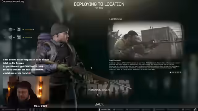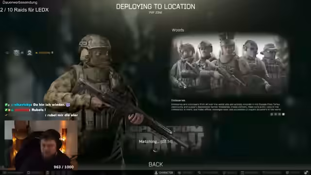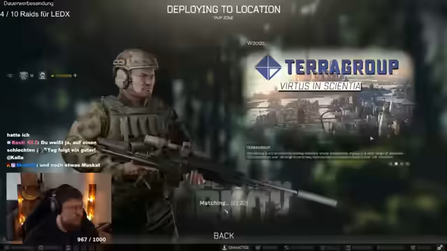 01:45:10Zur Unterhaltung der Community startet der Streamer eine persönliche Challenge: Er hat 10 PMC-Runden Zeit, auf der Map Woods einen speziellen Gegenstand namens „Lettix“ zu finden. Gelingt ihm dies, muss sein Freund Ledix einen Clip von sich in einer 10er-Bombe hochladen, schlägt er fehl, erhält Ledix für 10 Monate einen kostenlosen Subscription auf dem Kanal. Gleichzeitig bietet der Streamer dem Chat an, Fragen zu Taktiken, Quests und Orten in Escape from Tarkov zu beantworten.