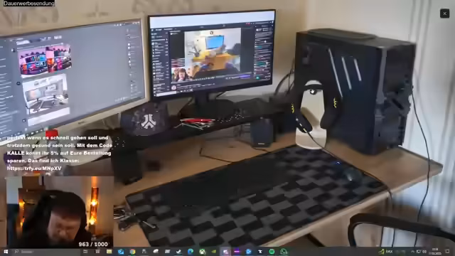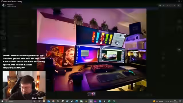 03:01:03Der Schreibtisch wird als kleiner IKEA-Schrank beschrieben, bei dem eine Wand rausgebrochen wurde. Die Kreativität wird gelobt, aber die Funktionalität infrage gestellt. Monitore werden an einem Mount aufgehängt, aber das Spielen auf einem Schrank wird als heftig beschrieben. Ein Donation-Golf wird vorgeschlagen, damit der Streamer einen richtigen Schreibtisch kaufen kann. Der Stuhl wird als Küchenstuhl von Oma beschrieben, aber das Sofa sieht nicht billig aus. Ein Unterschrift von Fritz und Stronger Crusader wird gezeigt.