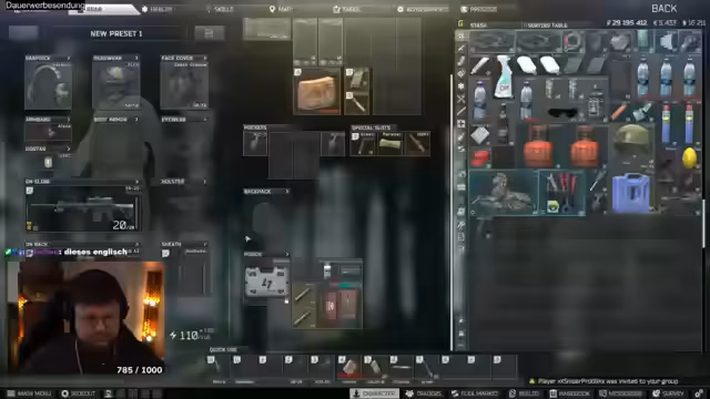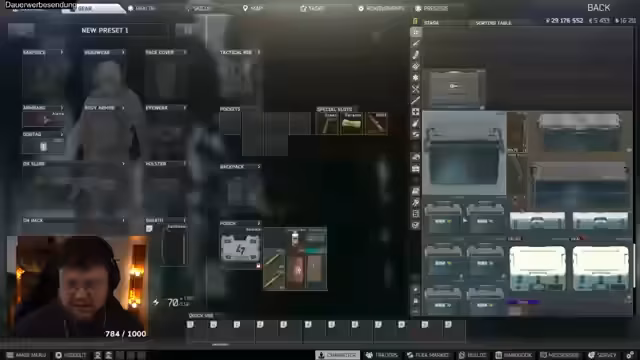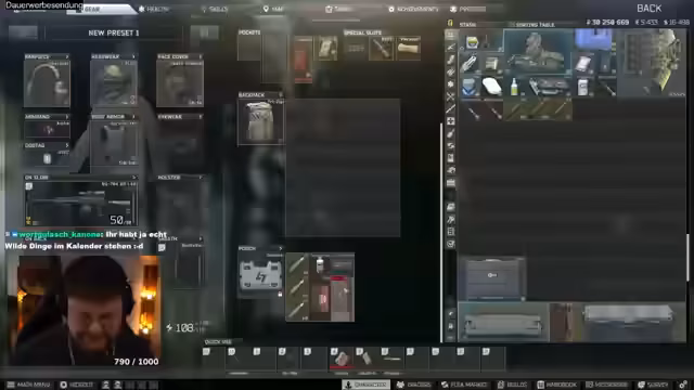 03:47:11Der Streamer stößt auf ein technisches Problem in Tarkov, bei dem sein Charakter in einer Matratze stecken bleibt. Er versucht verschiedene Lösungsansätze, darunter das Ausziehen der Ausrüstung und das Neuladen des Spiels, was jedoch nicht zum Erfolg führt. Währenddessen unterhält er sich mit der Community über mögliche Lösungen und kommentiert die absurde Situation humorvoll, bevor er den Stream beendet.