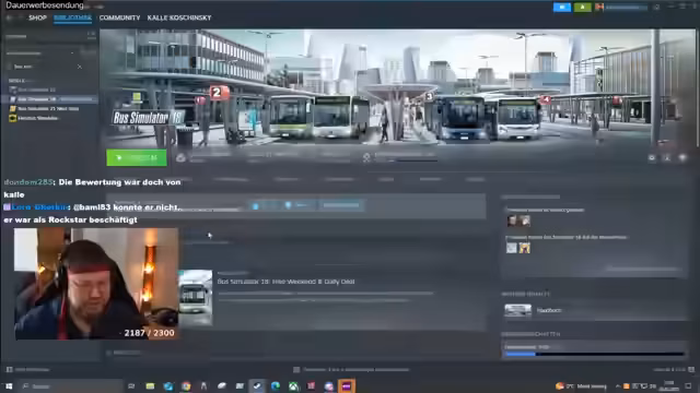 00:57:35Da der ursprüngliche Bus Simulator nicht zufriedenstellend funktionierte, wechselt der Streamer zum Fernbus-Simulator. Auch hier gibt es Hürden: Er kann seine Route nicht starten, da sie auf DLC-Inhalte angewiesen ist, die er nicht kaufen möchte. Nach mehreren gescheiterten Versuchen, eine funktionierende Route zu finden, beginnt er widerwillig eine Fahrt von Stuttgart nach Köln, zeigt sich aber weiterhin unzufrieden und überfordert mit dem Spiel.