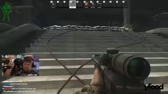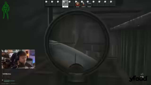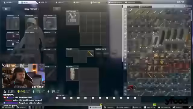 01:29:01Der Stream beginnt mit dem Ziel, die Killa Hunt Quest in Tarkov abzuschließen. Der Streamer kleht sich neu ein und betritt das Spiel. Er beschreibt seine Strategie, den Boss Killer zu finden und zu eliminieren, und erkundet eine Karte mit viel Blut und Munition. Es wird eine Statistik gezeigt, die den Fortschritt bei der Anzahl der benötigten Kills anzeigt. Der Streamer spricht seine Nerven und die Motivation durch, das Ziel zu erreichen.