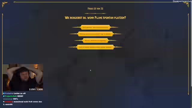 01:10:38Der Streamer beantwortet Fragen zu Alltagsstressoren wie unklaren Informationen oder 2000 ungelesenen Chats, die ihn am meisten triggern. Bei Konflikten bevorzugt er direkte, aber ruhige Kommunikation ohne Schriftlichkeit und betont Respekt. Zu Lebensrhythmus und Schwierigkeitsgrad gibt er 'Hardcore' an – ohne Plan für die Zukunft. Technische Fehler bei Streams stören ihn am meisten. Er stellt fest, dass er als 'Eckensitzer' sitzt, spontane Erlebnisse liebt und nach Gefühl entscheidet, aber zu spät kommt. Bei Zombie-Apokalypse wählt er 'Waffen bauen' statt Gartenarbeit.