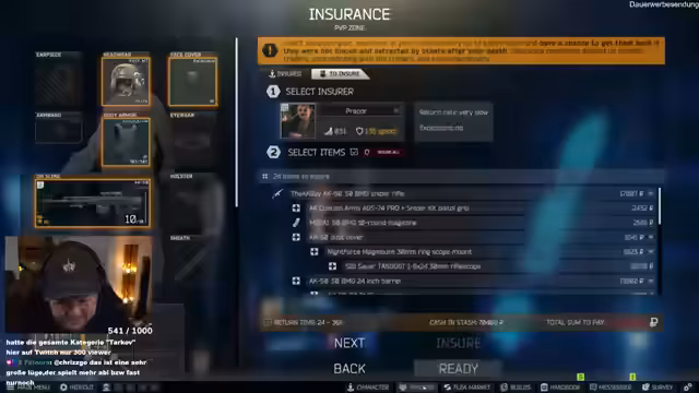 01:22:04Zu Beginn der Stream-Sequenz steht das Spiel Escape from Tarkov im Mittelpunkt. Der Streamer beschäftigt sich intensiv mit dem Inventarmanagement, der Frage, welche Objekte im Labor mitgenommen werden können und welche Waffen im Moment optimal sind. Es kommt wiederholt zu Frustration, als er feststellt, dass teure Gegenstände wie ein Megamedel auf dem Flea-Market nicht oder nur unter schwierigen Bedingungen verkauft werden können. Er äußert Verärgerung über den Spielspaufaktor und stellt in Frage, wer noch täglich dieses Spiel mit Freude zockt.
