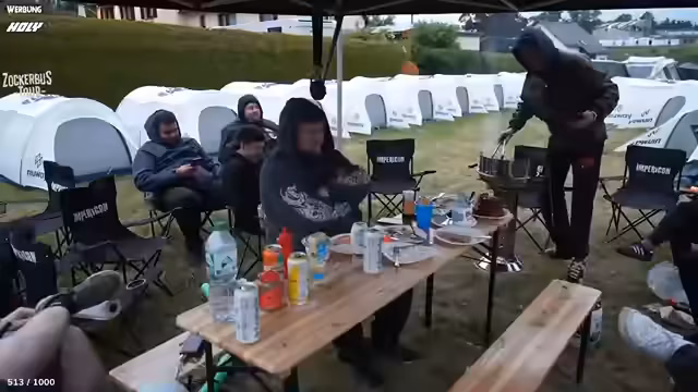 08:20:13Der Fokus liegt auf der Interaktion mit dem Chat, der um Feedback zum Grillen gebeten wird. Es entstehen humorvolle Konzepte wie das Stücken auf den Dingen, wobei Gegenstände auf dem Teller balanciert werden. Parallel dazu wird die Festivalstimmung beschrieben, darunter die Ankunft weiterer Personen, der Bau von Zelten und die Beobachtung von Festivalbesuchern, die mit der Organisation ihrer Unterkünfte kämpfen. Auch die Vorlieben der Chatmitglieder für Grillgerichte wie Stockbrot und Marshmallows werden besprochen.