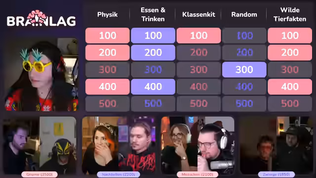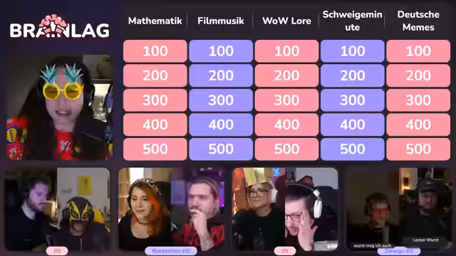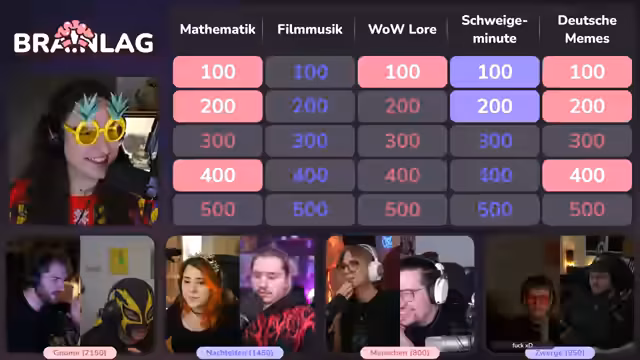 06:53:01Die Quizfragen aus den Kategorien WoW-Lore, Memes, Filmmusik und Mathe erfordern breites Wissen. Einige Fragen lösen große Begeisterung aus, wie die korrekte Antwort 'Gladiator' zur Filmmusik-Frage für 400 Punkte. Andere Fragen, wie die nach der PQ-Formel, führen zu technischen Problemen mit dem Buzzer-System. Es gibt auch lustige Momente, bei denen Antworten wie 'Jürgen Hurensohn' die Teilnehmer zum Lachen bringen und Moderatoren vor Herausforderungen stellen.