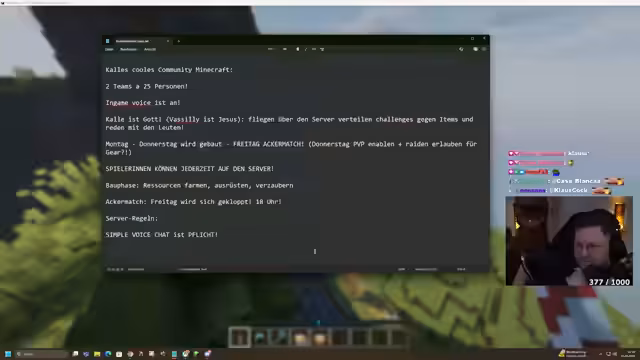 00:11:54Es wird über das Wochenende gesprochen, inklusive eines Besuchs auf dem Trödelmarkt. Es wird eine Anekdote über einen missglückten Friseurbesuch geteilt, bei dem der Bart zu kurz geschnitten wurde. Der Streamer spricht über frühere Erfahrungen beim Friseur und vergleicht diese mit dem aktuellen Erlebnis. Es wird die Vorbereitung für ein Minecraft Community Event angekündigt, das von der Idee her an Videos angelehnt ist, in denen Leute Zivilisationen bauen und gegeneinander kämpfen. Der Streamer erklärt, dass es sich um eine limitierte Auflage handelt und ein Server von DevCookie gespendet wurde. Es wird ein Voice-Over-IP-Tool geben, und der Streamer wird als "Gott" fungieren. Die Idee ist, dass sich zwei Lager bilden und es eine Whitelisting-Phase auf dem Discord geben wird. Das Event soll täglich von 11 bis 16 Uhr stattfinden, aber das Bauen ist jederzeit möglich. Am Ende der Woche wird es einen Clash geben, bei dem die Teams gegeneinander kämpfen müssen. Es wird die Java-Version von Minecraft gespielt. Es wird eine Peaceful-Phase geben, in der man keine anderen Spieler töten kann, bis der Startschuss fällt. In der Zwischenzeit kann gefarmt und sich connected werden, und es wird feste Teams geben, die ausgelost werden. Es wird bestimmte Orte für die Basen geben, und am Ende wird es eine Arena geben, in der gekämpft wird. Tod ist Tod, sobald PvP aktiviert ist. Die Woche dient dazu, sich aufzurüsten und in den Nether zu gehen. Der Chat kann mitentscheiden, welche Challenges die Teams ingame machen müssen, und es wird eine Belohnung geben.