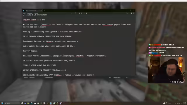 01:30:30Es wird erklärt, dass auf dem Stream ein großer Textblock mit Informationen zum Kalles Ackermatch Community-Minecraft-Event gezeigt wird. Das Event startet ab heute und es findet eine Whitelisting-Phase auf dem Discord statt. Zwei Teams mit je 25 Personen werden sich bekriegen, wobei Ingame Voice mit Simple Voice Chat verwendet wird. Der Streamer wird das Ganze mitverfolgen, Items verteilen, mit den Leuten interagieren und Challenges machen. Von Montag bis Donnerstag sollen sich die Leute equippen, am Freitag findet dann das Acker-Match statt. Bis Donnerstag gibt es kein PvP, aber es wird überlegt, ob man Donnerstag PvP aktivieren soll. Es gibt eine Bauphase bis Donnerstag, in der Ressourcen gefarmt und Gegenstände verzaubert werden können. Am Freitag um 18 Uhr findet dann ein Hardcore-Deathmatch in einer Arena statt, bei dem das Team gewinnt, das am Ende noch Überlebende hat. Das Event wird für YouTube aufgenommen und jeder kann mitmachen und streamen.