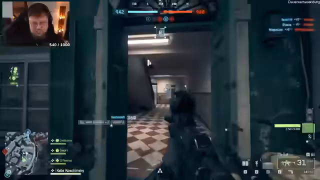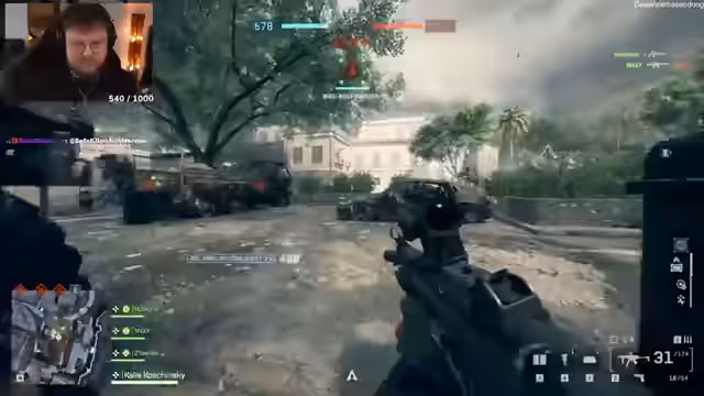 00:26:57Der Streamer navigiert seine Einheit durch ein intensives Gefecht. Er agiert als JTAC (Joint Terminal Attack Controller) und koordiniert Luftunterstützung, während sein Team vorrückt. Die Kämpfe finden in urbanen Umgebungen statt, wobei der Streamer sowohl von feindlichen Panzern bedroht wird als auch selbst Jagd auf Gegner macht. Er beschreibt das Geschehen als sehr actiongeladen und filmhaft, auch wenn er durch den hohen Druck und den Tod von Teammitgliedern frustriert ist.