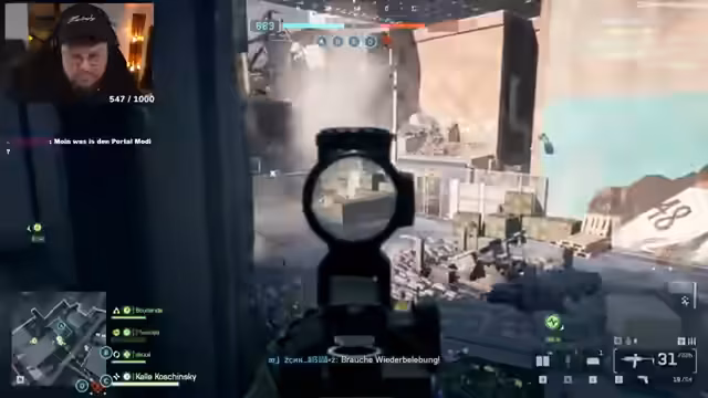 06:27:38Ein technisches Problem tritt auf, als der Streamer eine Verbindungstörung mit einem Squad-Mitglied feststellt und das Spiel neu starten muss. Gleichzeitig beschwert er sich über störende Verkäufer von Vodafone, die vor seiner Tür stehen. Im interagiert er intensiv mit dem Chat, um nach Lösungen für Spielmechaniken, wie z. B. das Verstauen von Leichen, zu suchen und die Steuerung per Gamepad versus Maus zu diskutieren.