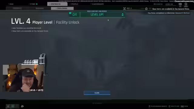 00:29:44Der erste Raid endet vorzeitig. Kalle kehrt zur Basis zurück und entdeckt das Base-Management-System. Er kann Einrichtungen platzieren und die Basis erweitern, benötigt dafür aber Ressourcen wie einen 'Shovel' und 'Route-Dissolver'. Es gibt Verträge (Contracts), darunter 'Scout'-Missionen für verschiedene Gebiete wie die Clinic und Port Authority. Nach Problemen mit dem Matchmaking (5 Minuten Wartezeit) startet ein zweiter Versuch. Kalle diskutiert die Key-Verteilung: Influencer mit Drops-Programm haben Keys erhalten und können sie weitergeben – er selbst bekam zwei von 'It's Chris'.