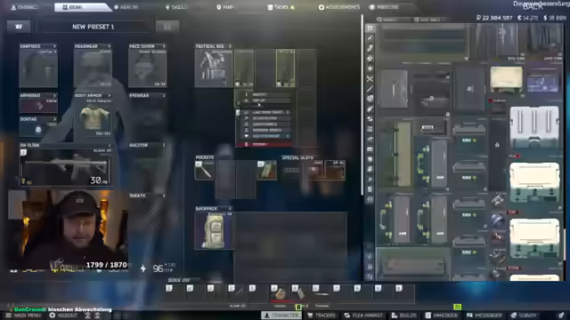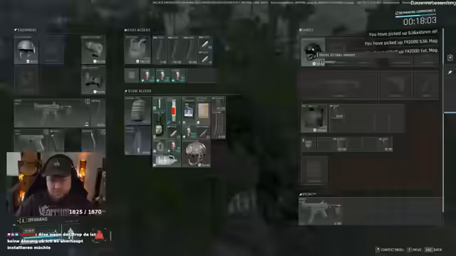 00:22:31Nach Tutorial-Fragen startet der erste Raid. Kalle bemerkt das smoothere Gameplay im Vergleich zu Tarkov (300 FPS mehr) und testet Grundmechaniken. Er stößt auf Probleme mit dem Inventarmanagement – das Laden von Magazinen dauert ewig, Quickslots funktionieren über die Taste '4'. Ein plötzlicher Jaguarsprungscare versetzt ihn in Panik. Die Grafik wird als gewöhnungsbedürftig beschrieben, insbesondere das Zielfernrohr zieht stark nach. Loot wird direkt eingesammelt, wobei überladen sein schnell zu Problemen führt. Eine Drohne wird getestet, scheitert aber.