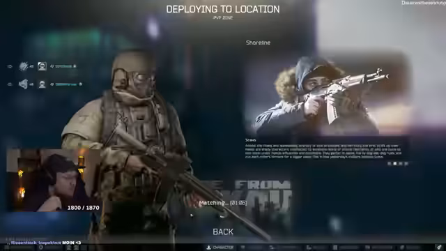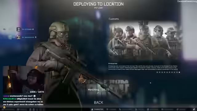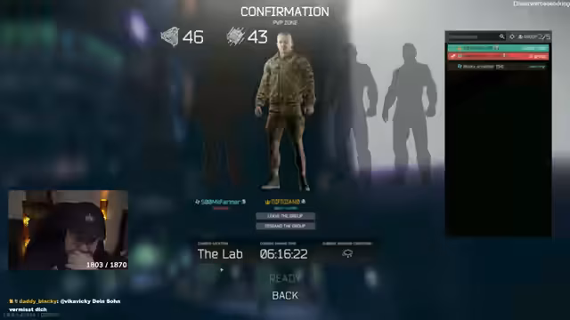 08:55:24Der Streamer interagiert mit einem Freund (Alias Zipi Giardo) und plant gemeinsame Tarkov-Runden. Sie diskutieren Quests wie Nachtkills und Flashbang-Kills, tauschen sich über Ausrüstung aus und überlegen, sich bei Missionen abzuwechseln. Dabei erwähnen sie auch die Herausforderungen von Nachtquests in Tarkov und technische Probleme wie Disconnects.