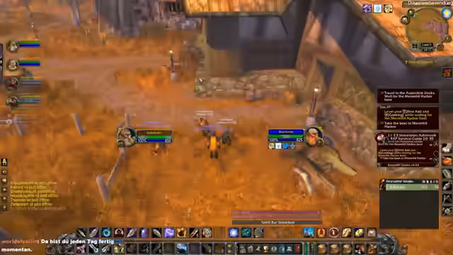 04:59:37Kalle bufft, öffnet Truhen und bespricht Upgrades. Gruppe überlegt, nach dem Abzeichen zu suchen, entscheidet sich aber gegen den langen Weg. Kalle empfiehlt Verlies oder BFD für morgen, da er zu hoch levelt, und fragt nach Ausweise-Status. Er plant nach Stormwind für Quests.