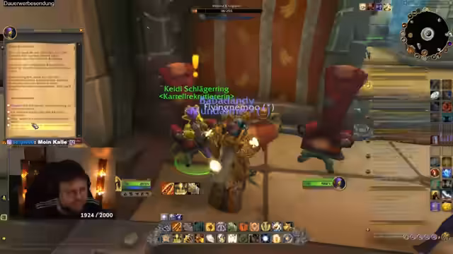 02:24:17Der Streamer erkundet die neue Zone Lorenhalt im World of Warcraft-Update. Er interagiert mit der Umgebung, wobei er technische Probleme wie Verzögerungen erwähnt und die Funktionsweise neuer Mechaniken wie eines Steuerungsvogels erklärt, der über die Region fliegen kann. Dabei findet er Hinweise auf die Handlung rund um das 'dunkle Herz', das von Goblins repariert werden soll.