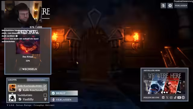 04:01:51Nach der Begrüßung der Zuschauer beginnen sie mit der Vorbereitung des Spiels 'We Were Here Too'. Es entstehen sofort technische Probleme mit den Mikrofoneinstellungen, da die Kommunikation über Ingame-Walkie-Talkies erfolgen muss. Nach mehreren Versuchen, das richtige Mikrofon in den Audioeinstellungen auszuwählen und das Spiel neu zu starten, gelingt es ihnen schließlich, die Verbindung herzustellen und das Spiel zu starten, wobei sie wertvolle Zeit verlieren.
