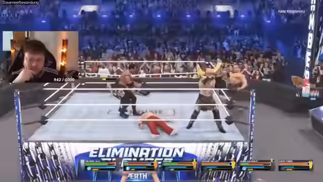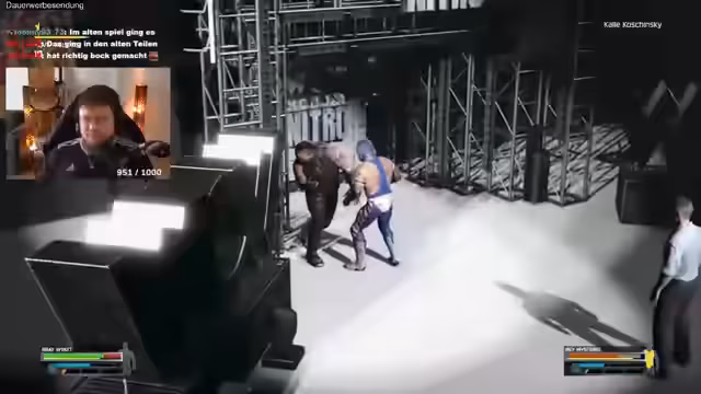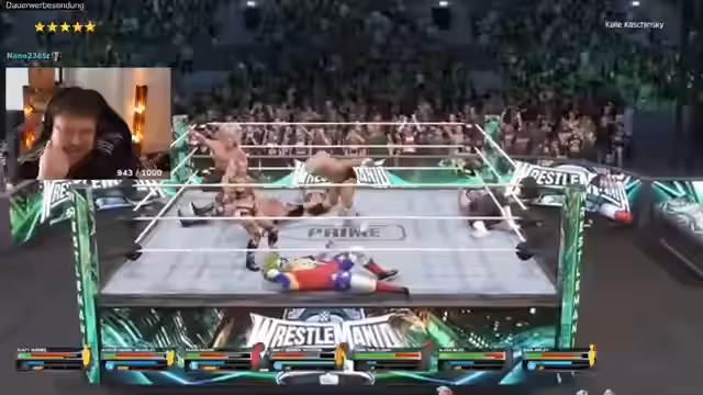 02:08:45Der Stream beginnt mit einem WWE2K25 Match, bei dem der Streamer versucht, Gegner auszuschalten. Er äußert sich frustriert über die Mechanik und die Arena, die er als limitiert beschreibt. Es kommt zu mehreren Angriffen und Gegenangriffen, wobei der Streamer seinen Gegner gegen das WWE-Symbol werfen will, jedoch scheitert. Die kommentierten Aktionen sind schnell und chaotisch, mit Fehlern und verpassten Chancen, was die Schwierigkeit des Spiels auf dem Schwierigkeitsgrad 'Legendär' verdeutlicht.