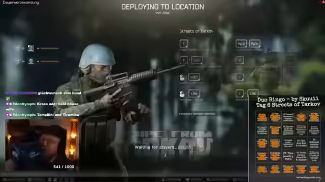 03:31:44Das Bingo-Turnier beginnt um 18 Uhr mit Escape from Tarkov als Spielmodus. Die Teilnehmer müssen verschiedene Aufgaben erfüllen wie Sammeln von Getränken, Singen von Disney-Liedern per VoIP, Töten von Bossen und Sammeln von bestimmten Items. Die Zusammenarbeit im Team ist entscheidend, um die Bingokarten zu vervollständigen.