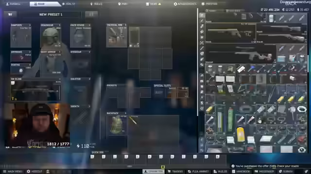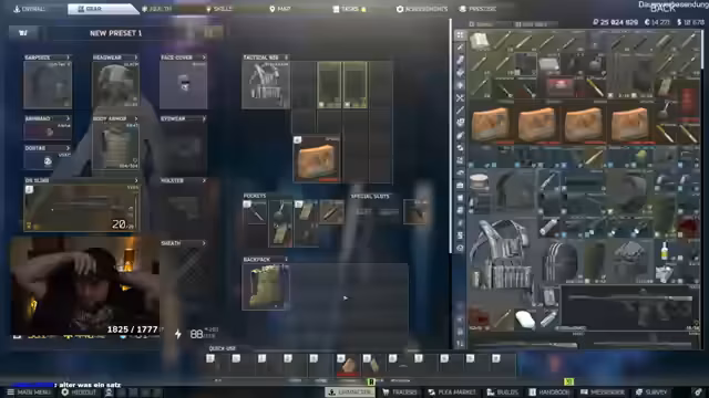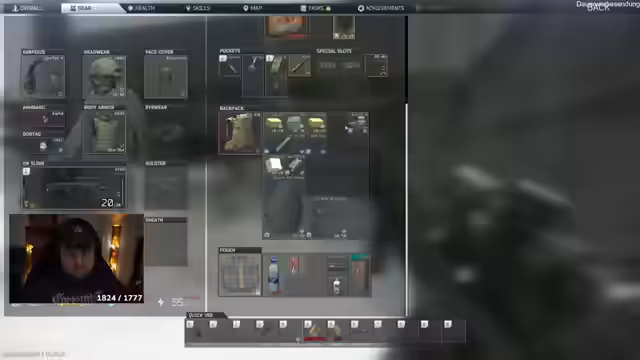 08:00:20Der Streamer überprüft seine Quest-Fortschritte. Er hat die 'Dekontaminations'-Quest abgeschlossen und benötigt nur noch Kills mit einer Shrimp-Pistole und SVD-Gewehren. Er bespricht mit seinem Team, wo er die SVD-Kills am besten machen kann und stellt fest, dass er die Punisher-Quest Serie beinahe abgeschlossen hat. Sie scherzen über ihre 'Täter-Crew' und loben den 'Täter-Container'. Anschließend plant der Streamer seine Ausrüstung für zukünftige Raids, indem er überlegt, welche Taschen (Document Case, Injector Case) und Heilitems (Grizzly) er mitnehmen wird.