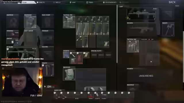11:02:47Der Streamer kommentiert die Spielsituation in Tarkov, wobei er feststellt, dass Trinken im Spiel süchtig macht. Er diskutiert die Verwendung der S-12 und deren Kosten. Es wird ein fehlendes Trinken bemängelt und vermutet, dass es sich möglicherweise bei Scavs befindet. Die Gruppe plant, die Dächer abzulaufen und die Nordwand zu verlassen, in der Hoffnung, ein Auto zu finden, was jedoch nicht gelingt. Der Streamer freut sich über den Fund von 100 Schuss MyAP Munition, die er als gute Munition zum Spielen einschätzt, obwohl er sie noch nie benutzt hat. Er markiert, was er im Spiel noch erledigen muss und plant, mit seinem Mitspieler zusammenzuarbeiten, um zu sehen, was sie gemeinsam unternehmen können. Die Suche nach etwas zu trinken wird thematisiert, um möglicherweise die Straße hochgehen zu können.
