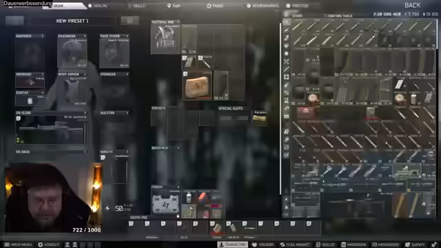 02:01:54Es werden Strategien für das neue Tarkov-Event besprochen, einschließlich der optimalen Ausrüstung und der besten Vorgehensweise, um im Dungeon zu überleben und erfolgreich zu sein. Der Streamer teilt seine Erfahrungen mit dem Looten im Dungeon, einschließlich des Findens von GPUs, Virtex und anderen wertvollen Gegenständen. Es wird die Bedeutung des Abschließens von Aufgaben im Zusammenhang mit dem Event hervorgehoben, und der Streamer plant, seine Aufgaben abzugeben und sich entweihen zu lassen. Es wird auch die Frage aufgeworfen, ob es im Stash noch Platz für weitere Gegenstände gibt, was die Fülle an Loot im Dungeon widerspiegelt. Der Streamer entdeckt neue Poster im Spiel, die möglicherweise mit dem Event zusammenhängen, und überlegt, ob er sie verkaufen soll. Er bereitet sich auf eine weitere Runde im Dungeon vor, indem er seine Ausrüstung optimiert und eine neue Karte kauft, um Zugang zum Dungeon zu erhalten. Die Vorfreude auf weitere Erkundungen und das Finden von noch mehr Loot ist spürbar.