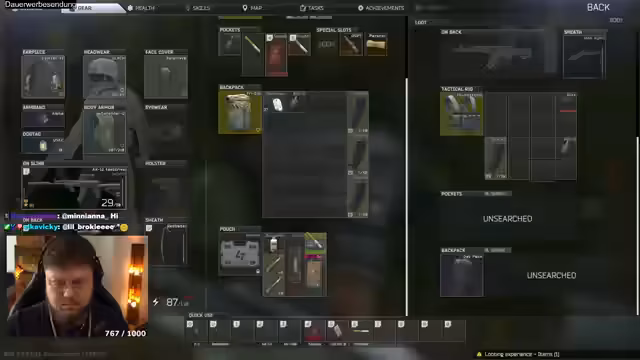 01:33:40Während eines laufenden Raids im Labyrinth meldet der Streamer das Auftaoten von toten Spielern und dem Boss Tagilla. Ein Teammitglied wird getötet, der Streamer selbst ist tot und es wird ein Killer-Spawn vermutet. Nach dem Raid wird eine Care Reset-Gruppe gesucht und der Streamer plant, den Tag mit einem Abgang über den KWM zu beenden.