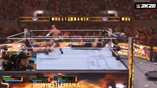 02:24:01Ein zentrales Thema des Streams ist die detaillierte Vorstellung des neuen Referee-Modus. Es wird erklärt, dass Spieler als Schiedsrichter agieren, Pin-Falls, Auszählungen und Disqualifikationen durchsetzen müssen, dabei aber auch die WWE-Regeln brechen können. Ein Schlüsselmechanismus ist die Möglichkeit, vorzeitig zu gongen, was jedoch den Finisher-Vorrat kostet. Dies wird in einem lauten und chaotischen Match gegen einen Undertaker-CPU-Gegner live demonstriert.