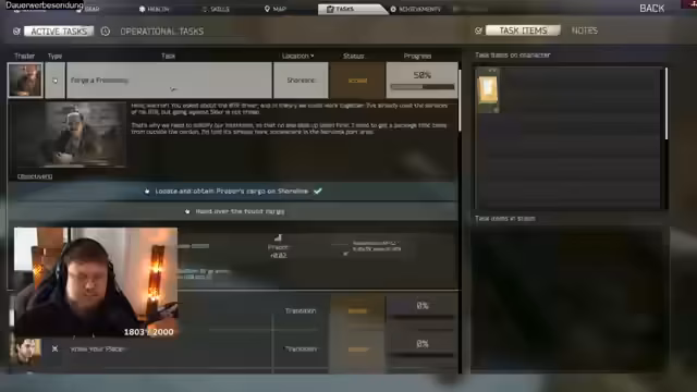 00:18:03Es wird angekündigt, dass im Stream Psychosniper und Nachtgills Quests absolviert werden sollen, um Prestige zu erreichen und danach neue Spiele zu spielen. Es wird erwähnt, dass die Weekly Quests fortgesetzt werden und Psycho-Sniper und Insomnia auf Shoreline gemacht werden. Der Streamer erwähnt gesundheitliche Probleme wie Magenkrämpfe und Erbrechen in der Nacht, was ihn dazu veranlasst, möglicherweise einen Arzt aufzusuchen. Gestern wurde die Wunst-Firstrei erfolgreich abgeschlossen und The Guide off-stream gemacht. Spätestens nächste Woche soll Prestige erreicht werden, gefolgt von ersten Quests und dem Übergang zu neuen Spielen. Es wird überlegt, wann die Hand angegangen werden soll. Der Plan für die aktuelle Runde ist, sich am Maprand zu bewegen und zum Paracord Exit zu gelangen, da Shoreline eine der Maps ist, wo dies möglich ist.