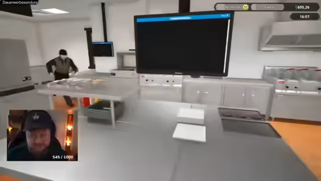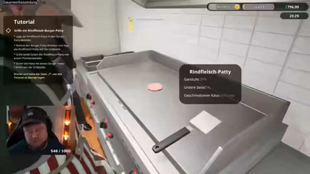 04:33:02Der Streamer 'Sebastian' wird als neuer Mitarbeiter angeworben und soll die Burger zubereiten, da der andere Angestellter scheinbar unfähig ist. Nach anfänglichem Chaos übernimmt Sebastian die Bratstation, während der Streamer die Bestellungen entgegennimmt und Getränke zubereitet. Die Zusammenarbeit wirkt unkoordiniert und ineffizient.