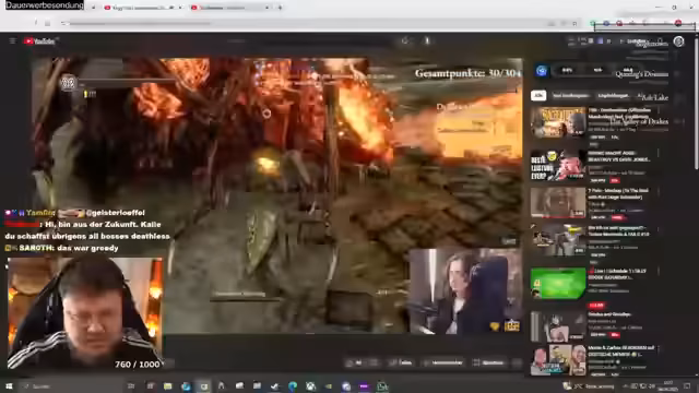 01:42:49Der Streamer kommentiert seinen hohen Schaden und fragt nach dem Namen eines Gegners im Chat (Channeler). Er überlegt, ob er zum Fireborn zurückkehren darf, um sich zu heilen, ohne gegen die Regeln zu verstoßen. Er fragt sich, ob er zum Hauptlager gehen soll. Kalle hat 19 Punkte, genauso viel wie Hand of Blood. Er vergleicht sich mit einem Fickearm in einem Koi-Karpfen. Er fällt herunter, weil er die Liste auf seinem zweiten Bildschirm geöffnet hat. Er bittet um einen Clip von seinem Tod. Er ärgert sich über seinen Tod, freut sich aber, dass er diesmal die Claymore bekommen hat. Er gibt zu, dass der Helm ihn genervt hat. Er hätte weglaufen oder resetten können. Kalle ist mit 19 Punkten zusammen mit Zombie und Hanno gestorben. Er wollte mehr Punkte machen, aber es hat nicht gereicht. Er findet seinen Tod nicht so schlimm wie beim letzten Mal, da er diesmal durch eigene Unachtsamkeit gestorben ist. Er glaubt, dass er gesagt hat, dass dies der Run ist. Er kündigt an, dass sie demnächst Dark Souls 2 spielen werden und dass er Path of Exile auch noch spielen wird. Er plant, ab dem 21. April mit Dark Souls 2 zu beginnen und es vorher einmal durchzuspielen. Er wünscht den anderen Teilnehmern viel Glück. Er kommentiert das Spiel eines anderen Teilnehmers, der sehr vorsichtig spielt.