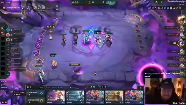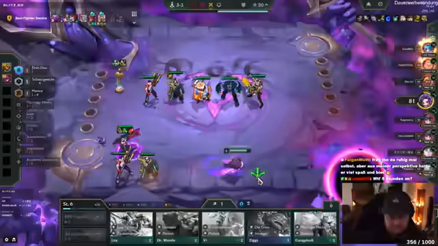 03:23:00Im Finale der TFT-Runde benötigt der Streamer eine Poppy und bessere Items, um eine Chance auf den Sieg zu haben, doch er findet keine und bleibt auf einem zwölften Platz hängen. Er ist unzufrieden mit dem Ausgang und gibt sich selbst die Schuld für zu viele riskante Entscheidungen wie übermäßiges Rollen. Trotzdem bleibt er bei seiner Einschätzung, dass seine Setup-Tank-Fähigkeiten stark waren, und philosophiert über die Schwierigkeiten, mit dem aktuellen TFT-Set weiterzumachen und seinen Schlafrhythmus zu regulieren.