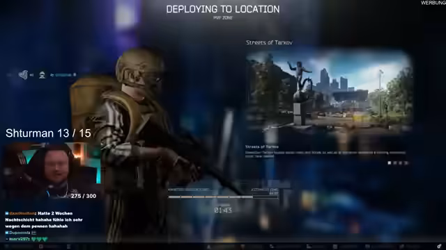 00:01:30Der Stream beginnt um späte Stunde, da der Streamer eine ungewöhnliche Nachtruhe hatte. Er spielt Escape from Tarkov, ein bekanntlich anspruchsvolles Spiel. Sein Hauptziel ist es, die Spielgeschichte abzuschließen, wofür er zunächst noch sechs Amulette auf der Karte Lighthouse finden und anschließend bei einem NPC abgeben muss. Dies ist die letzte verbleibende Aufgabe vor dem finalen Escape, das das Spielende markiert. Nach diesem Erfolg will er seine Charakterstufe Prestige 3 erreichen, indem er weitere 25 Gegner töten.