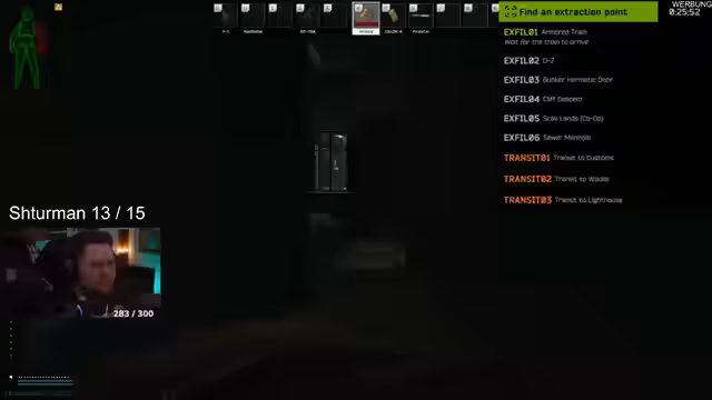 02:59:16Kalle startet einen neuen Versuch direkt auf der Terminal-Karte. Er ist hochgradig aufgeregt, da dies sein erstes Mal auf dieser speziellen Map ist. Er spawn mit anderen Spielern zusammen und muss sofort nach seinem gespawnten Equipment suchen. Er findet seinen Weg in das Hauptgebäude, ist aber von der Kartendarstellung und der räumlichen Orientierung überfordert. Obwohl er einige Gegner töten kann, scheitert er daran, die spezifische Leiche mit dem Schlüssel für die Armory zu finden und wird letztendlich von der Black Division getötet.