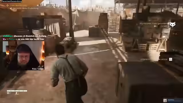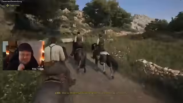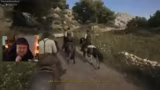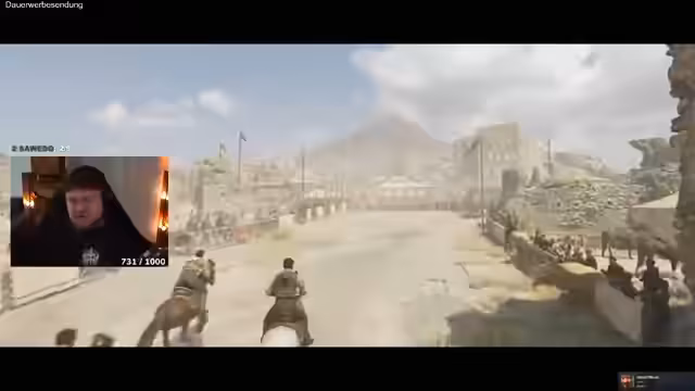 02:00:39Nach einem Training mit der Waffe, bei dem der Streamer defensive Ausweichmanöver lernen soll, wechselt die Szene zu einem Pferderennen. Das Rennen dient dazu, eine Bekannte, Isabella, vor ihren Verfolgern zu retten. Das Rennen selbst verläuft turbulent, wird aber schließlich erfolgreich und knapp gewonnen. Danach folgt ein Spaziergang durch die Stadt und die Erledigung einfacher Aufgaben wie das Schleppen von Kisten.