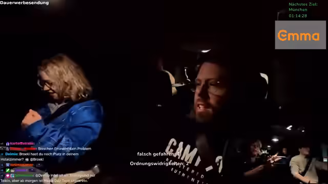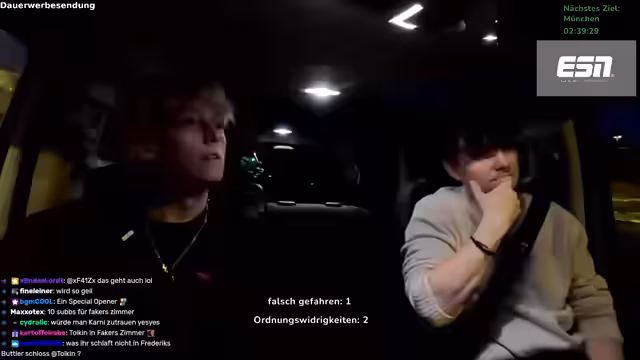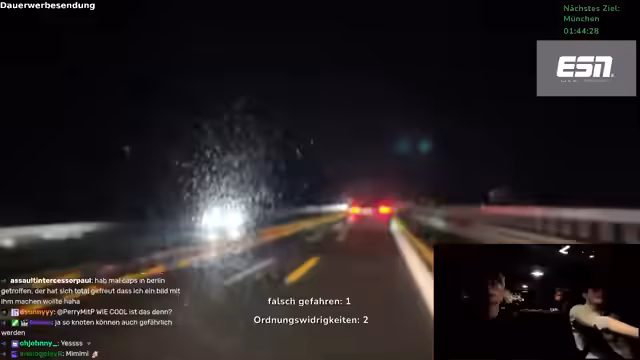 03:54:18Die Gruppe befindet sich auf einem Roadtrip nach München, um an einem eSports-Event teilzunehmen, bei dem sie gegen den Weltmeister antreten werden. Begleitet werden sie von Bröki, Karni, Kathleen, Alina und Hanna. Der Roadtrip dient auch dazu, die ESN-Giveaways zu bewerben, die im Wert von über 1.000 Euro liegen und Preise wie ein Laufband, ein Hantelset, eine Klimmzugstange und eine Smartwatch umfassen. Die Streamer betonen, dass die Zuschauer weiterhin die Möglichkeit haben, an den Verlosungen teilzunehmen, auch wenn einige bereits stattgefunden haben. Die Reise nach München wird als spannendes Erlebnis dargestellt, das sowohl berufliche Verpflichtungen als auch unterhaltsame Interaktionen mit der Community verbindet. Die Ankunft in München wird in etwa sechs bis sieben Stunden erwartet, was die lange Fahrtstrecke verdeutlicht.