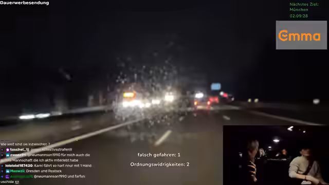 02:51:12Es wird humorvoll über die geringe Anzahl an Spenden für den Stream geklagt, wobei betont wird, dass es sich um ein 'Business' handelt und die Zuschauer aufgefordert werden, 'reinzuzappen'. Danksagungen gehen an verschiedene Supporter und Streamer, die den Roadtrip nach München ermöglichen. Die technische Ausstattung des Streams, insbesondere die GoPros, wird als selbstfinanziert und nicht gesponsert hervorgehoben. Es wird über die Aktivierung von Text-to-Speech und die Verbindung von Bluetooth-Geräten gesprochen. Eine humorvolle Anekdote über eine 'Polizei-Donation' und die Beleidigung von Kathleen wird erzählt. Die fehlende Jacke von Bröki wird thematisiert, und Alina bietet ihre zweite Jacke an. Die Diskussion über die Kleidung und das Merch des Kanals führt zu einer Ankündigung, dass die Kleidung in der ersten Dezemberwoche versendet wird und vor Weihnachten ankommen soll. Kani's Ankunft und ihre bevorstehende Fahrt werden humorvoll als 'letzte Momente' für die Mitfahrer bezeichnet, da Kani für ihre Fahrkünste bekannt ist. Es wird über die Anzahl der Ordnungswidrigkeiten bei der letzten Fahrt gesprochen und die vielen Kameras im Auto erwähnt. Die Fahrt wird von humorvollen Kommentaren und Witzen begleitet, wobei Kani's Fahrstil und die Navigation durch Leipzig thematisiert werden.