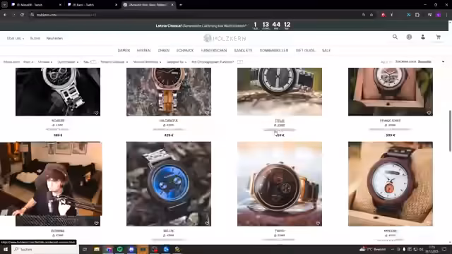 06:12:56Karni wirbt für eine Partnerschaft mit Holzkern, einem Anbieter von Holzschmuck und Uhren. Mit dem Code 'Carni' erhalten Zuschauer 15% Rabatt. Es werden verschiedene Produkte wie Armbänder, Chronographen und Damenuhren vorgestellt, betont wird die hochwertige Verarbeitung und die Garantie einer Lieferung vor Weihnachten. Die Werbeeinbindung erfolgt organisch während einer Spielpause, wobei Karni persönliche Favoriten zeigt und auf den Support durch Link-Klicks hinweist.