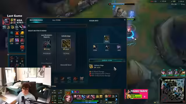08:00:44Die aktuelle Lane-Phase wird als nicht schlecht bewertet, obwohl sie schlimmer sein könnte. Der Spieler ist in CS (Creep Score) ausgeglichen, was für das Match-Up positiv ist. Es wird über die optimale Strategie nach dem Basen diskutiert, insbesondere wie viele CS dabei verloren gehen könnten. Eine Überlegung ist, ob man die nächste Wave hart pusht, aber da der Gegner auf der Lane bleibt, ist dies keine Option. Die Item-Wahl wird kritisiert, da der Spieler Attack Speed, aber keinen Schaden hat und keine T2-Boots kauft, um stattdessen ein BF-Sword zu priorisieren. Trotz eines 0-2 in der Mitte und 0-1 auf der Top-Lane sowie der Hälfte der CS auf der Top-Lane, bleibt die Zuversicht, den Gegner später zu töten. Die Situation wird als 'chillen' bezeichnet, obwohl man es hätte besser machen können. Ein BF-Sword wurde nun gekauft, was die Situation verbessert.