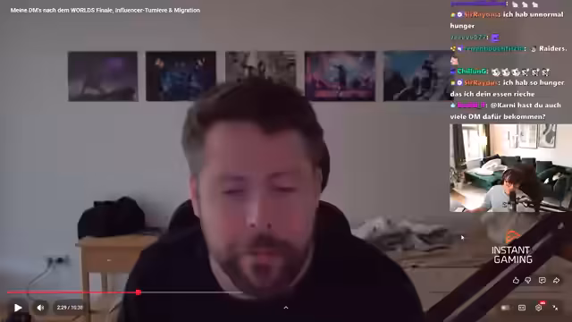 04:34:24Der Streamer teilt seine Pläne für die kommenden Wochen mit, darunter die Teilnahme an den Stream Awards, der Magenta E-Trophy und League of its Own. Er ist sich unsicher, wie viele Spiele er noch schaffen wird, betont aber, dass er spielen wird, solange er Lust und Zeit hat. Eine kurze Mittagspause wird angekündigt, um ein neues Brücke-Video anzusehen. Er berichtet von seinen Worlds-Finals-Predictions, die er auf Instagram geteilt hat. Obwohl er den Poppy-Pick von T1 als schlecht einschätzte und dies auch von anderen Experten geteilt wurde, gewann T1 das Spiel, was zu vielen spöttischen Nachrichten in seinen DMs führte. Er reflektiert über die Reaktion der Community und lobt die entspannte Atmosphäre in seinem eigenen Chat, wo auch sensible Themen wie Politik diskutiert werden können.