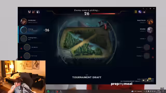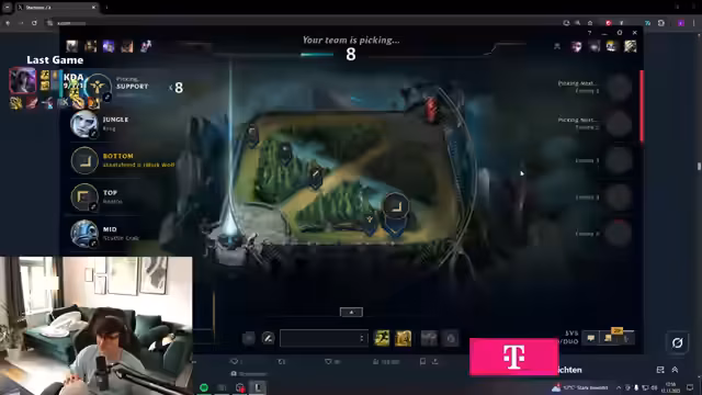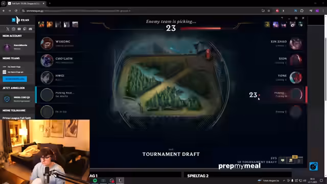 08:54:53Der Streamer kündigt an, ein Spiel der Prime League Division 4 zu kommentieren, in dem es um die Playoffs geht. Avarosa steht 5-3 und benötigt einen 2-0 Sieg gegen das zweitplatzierte Team (2-2-A), um sich zu qualifizieren, da nur die Top 2 weiterkommen. Der Draft wird analysiert: Wukong First Pick wird mit Xin geantwortet, was als legitim angesehen wird. Es wird über die Picks von Zion und Hawaii diskutiert, wobei Apollonia als gute Hawaii-Spielerin hervorgehoben wird. Der Redside-Draft mit vier Nahkampf-Champions und einem Swain wird als nicht optimal bewertet, insbesondere gegen einen High-Range-Carry wie Jinx. Renata oder Alistar wären als Support-Picks besser gewesen als Rakan, obwohl Rakan nie schlecht ist. Das Spiel wird als potenziell lang eingeschätzt, da beide Teams nicht das Material für ein schnelles Ende haben. Der Spectator-Bug, der zuvor aufgetreten ist, scheint behoben zu sein.