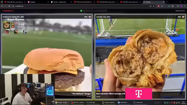 04:58:24Der Streamer bewertet Essen aus internationalen Stadien. Bei St. Louis City gegen FC Seoul wird Korean Spicy Chicken für 3 Pfund gewählt, da das Mac & Cheese zu fettig erscheint. Bei German Sausage zensiert gegen Liji in Blueberry Ice Roll entscheidet er sich für die Bratwurst, da er kein Eis-Fan ist. Für Decahuna Burger gegen Red Leicester Filled Sausage Roll wählt er die Sausage Roll, da sie billiger und lecker ist.