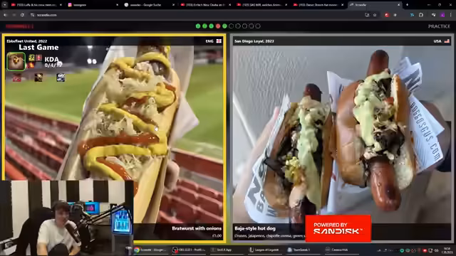05:04:01Ein Vergleich zwischen Bratwurst mit Onions (5 Pfund) und Baccia-Style-Hotdog (7 Pfund) wird durchgeführt. Der Hotdog wird gewählt, da er besser aussieht, Jalapenos enthält und zwei Hotdogs bietet. Parallel spielt er League of Legends und wählt Thresh, während er über sein Spiel frustratiert. Er kritisiert sein Team und diskutiert Champions wie Sivir und Bart. Ein Jhin in Top-Lane verwirrt ihn.