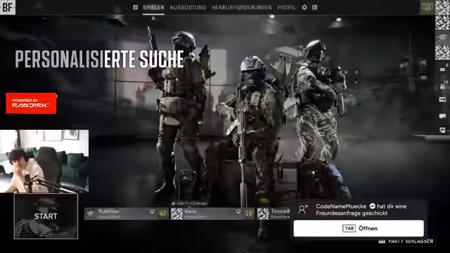 05:42:49Nach den Worlds-Inhalten wechselt der Streamer zu Battlefield und lädt Zuschauer zum gemeinsamen Spielen ein. Er plant, mit dem Chat einige Runden zu spielen und streamt dies offstream, falls der Server voll ist. Der Streamer teilt seinen EA-Namen (Kani) mit, um Einladungen zu ermöglichen. Während er sich einloggt, reflektiert er kurz den EU-Erfolg bei den Worlds und zeigt sich euphorisch über den Fortschritt von G2. Anschließend startet er die Matchmaking-Phase für den Multiplayer-Modus.