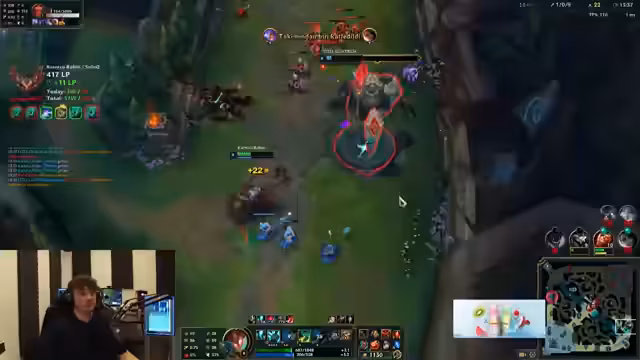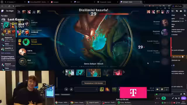 06:16:59Der Streamer kommentiert seine Ranked-Games im türkischen Server während des Challenger-Rushs. Er beschäftigt sich intensiv mit Spielmechaniken wie z.B. dem Fehlen eines Stuns in einem bestimmten Szenario, der Entscheidung, zu recallen, anstatt auf dem Ring zu farmen und der allgemeinen Spielsituation. Der Fokus liegt auf der notwendigen Konzentration und dem Leistungsniveau, das für den Erfolg auf diesem Server erforderlich ist, auch wenn er sich teilweise unprofessionelles Verhalten seiner Mitspieler anmerkt.